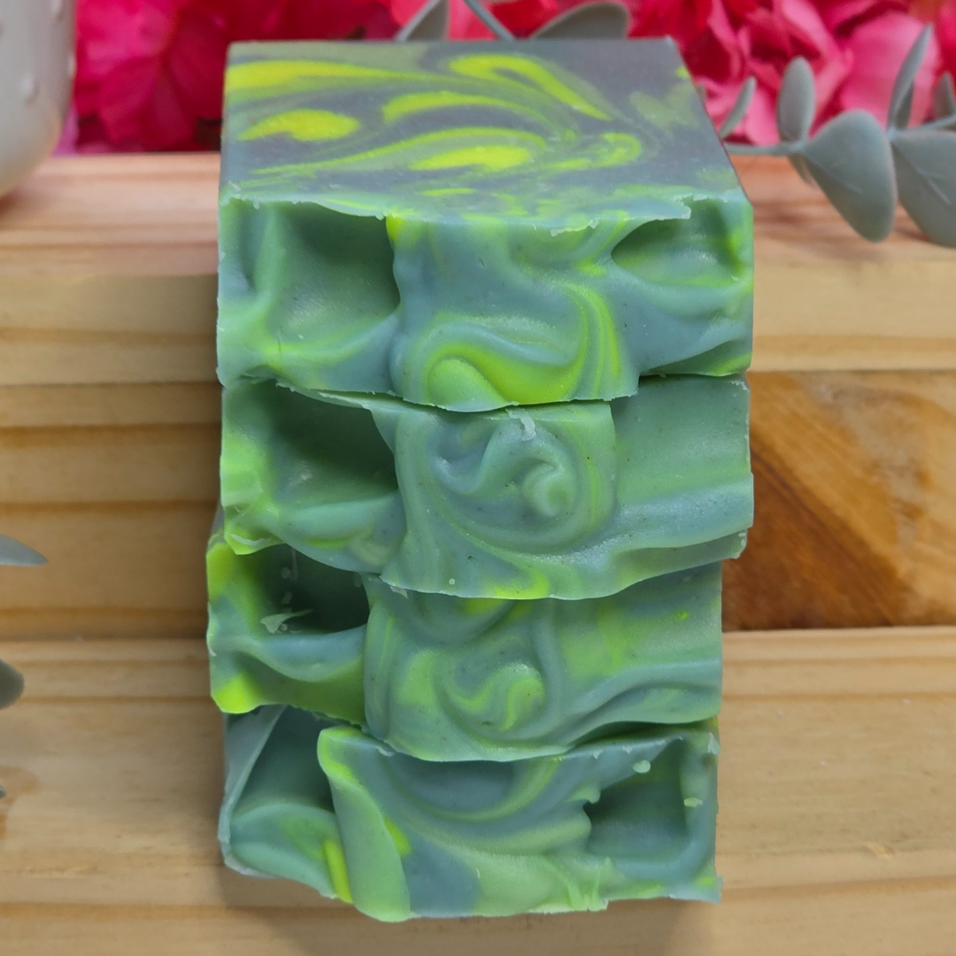 Aceite de oliva, aceite de coco, manteca de palma, aceite de albaricoque, aceite de ricino, aceite de cáñamo (hemp)., arcilla verde francesa, polvo de ortiga, vitamina E, aceite esencial de eucalipto, seda de tussah, fragancia segura para la piel, colorante natural.