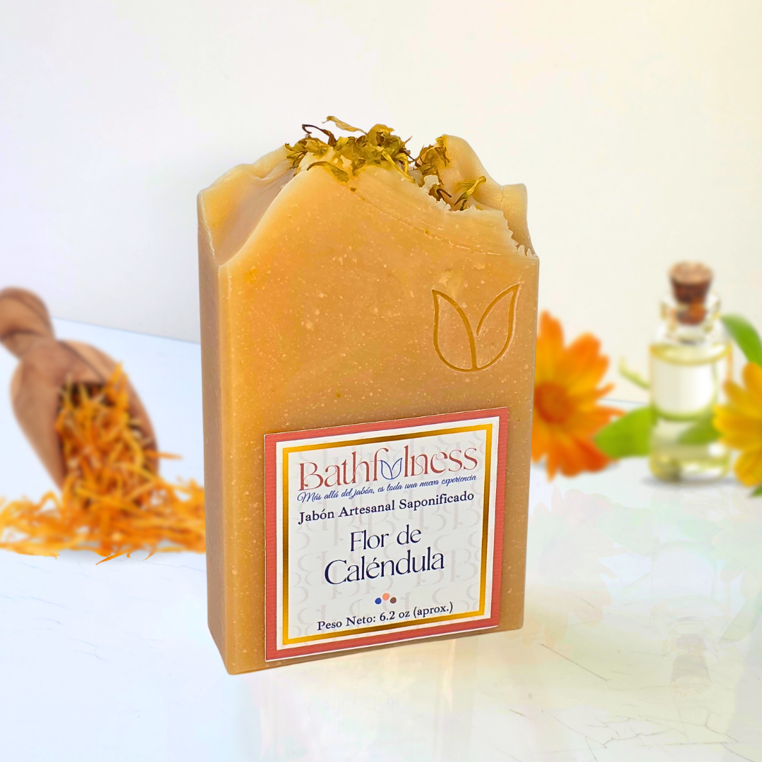 Aceite de oliva macerado con caléndulas, aceite de coco, aceite de palma, aceite de albaricoque, aceite de ricino. aceite de cáñamo, aceite esencial de caléndula, extracto de caléndula, arcilla caolina, avena coloidal, leche de coco, vitamina E, fragancia segura para la piel, colorante natural y seda de tussah.